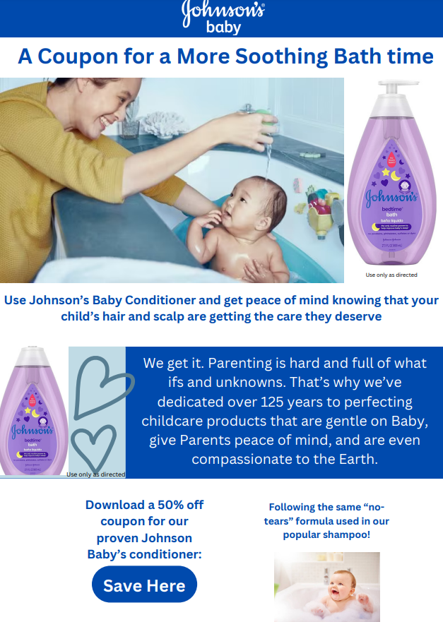 Opportunity: Johnson’s Baby offered a 50% off coupon for their baby conditioner product and wanted to share the good deal with their email subscribers. The goal was to spread awareness of this specific baby conditioner and encourage subscribers to become customers by clicking the links in the email.